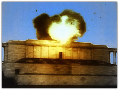 Hitler’s Zeppelin Arena (Prisoner) Building, with the NAZI Swastika being blown from the top at the end of WWII.