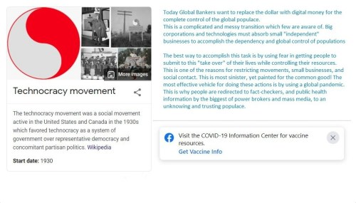 It is interesting, about a month ago I made a Facebook header featuring the 1930 Technocracy movement and explained how the world bankers wanted digital money and control. It went on to say that fear is used (like a global pandemic) to herd the masses to one’s will and control! The meme header is still there, but it’s the first posting I have seen that is “whited out” by FB to the public eye!
