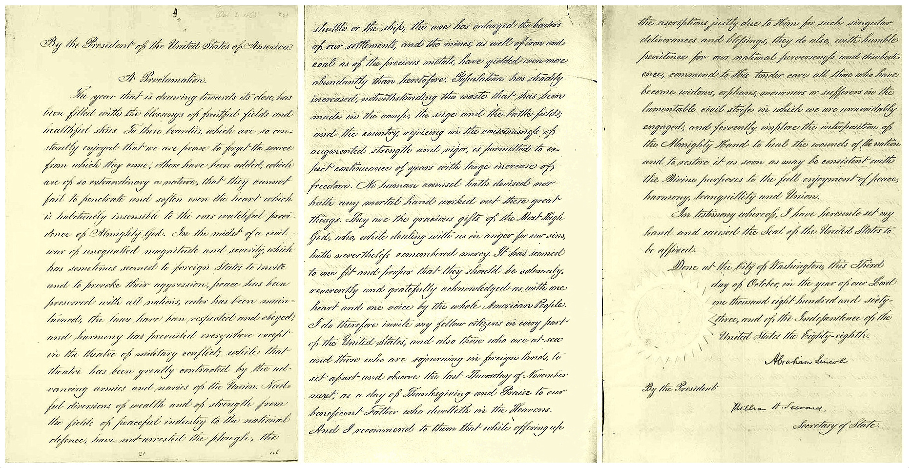 Transcript of President Abraham Lincoln’s Thanksgiving Proclamation from the National Archives, October 3, 1864