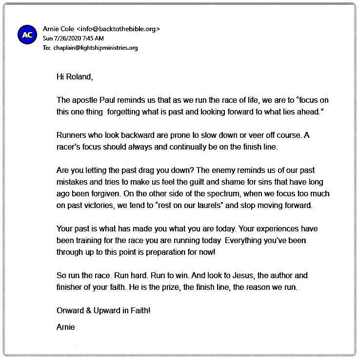 This is a screenshot of an email I received from Back to the Bible; it shows the true meaning of what the Apostle Paul was speaking about in “running the good race” for Christ. It is pure and simple, it reminds us that life is a challenge, and if we do not want to be disqualified, we will push forward in our faith to obtain the victory in every matter we might encounter!